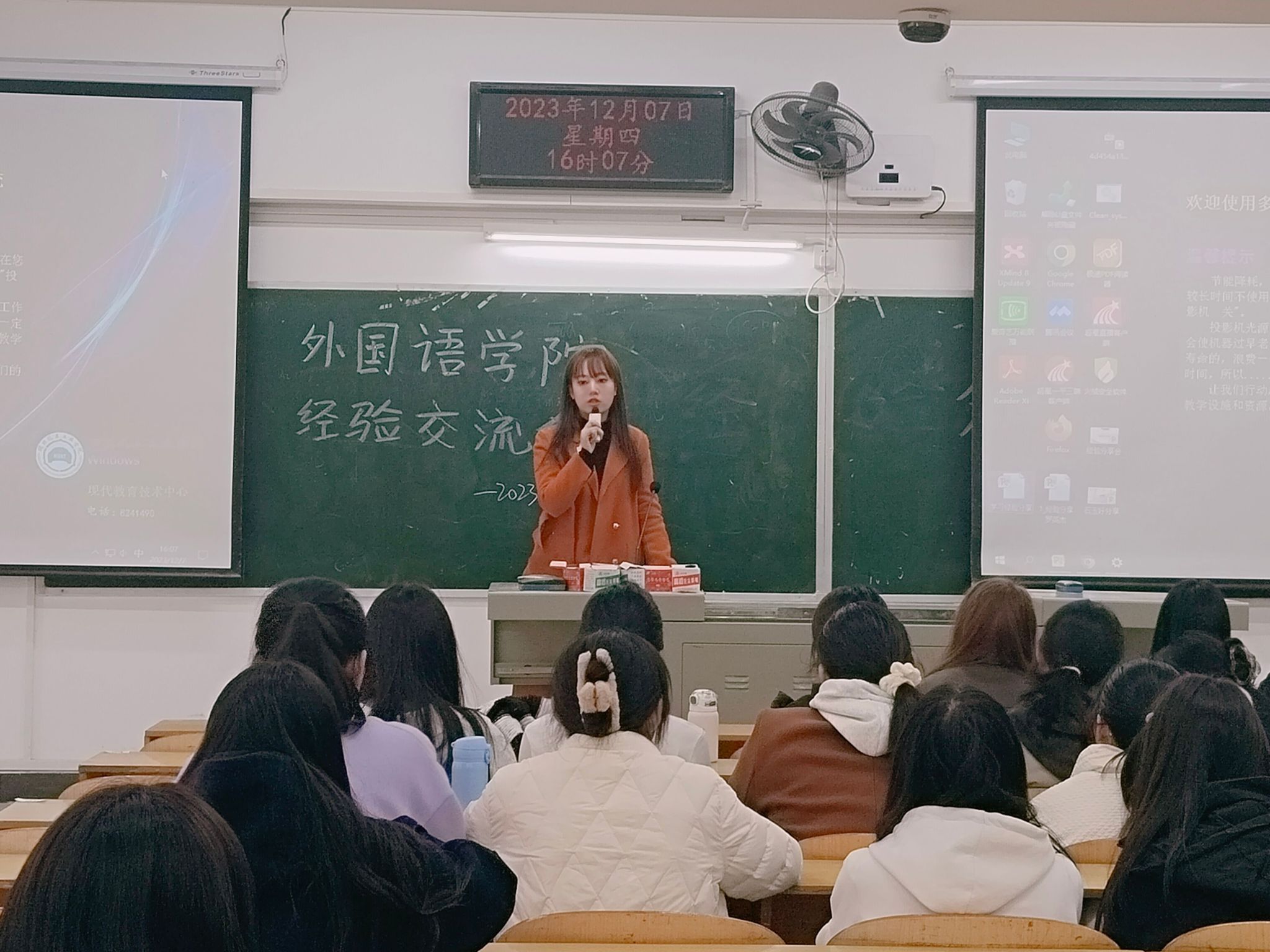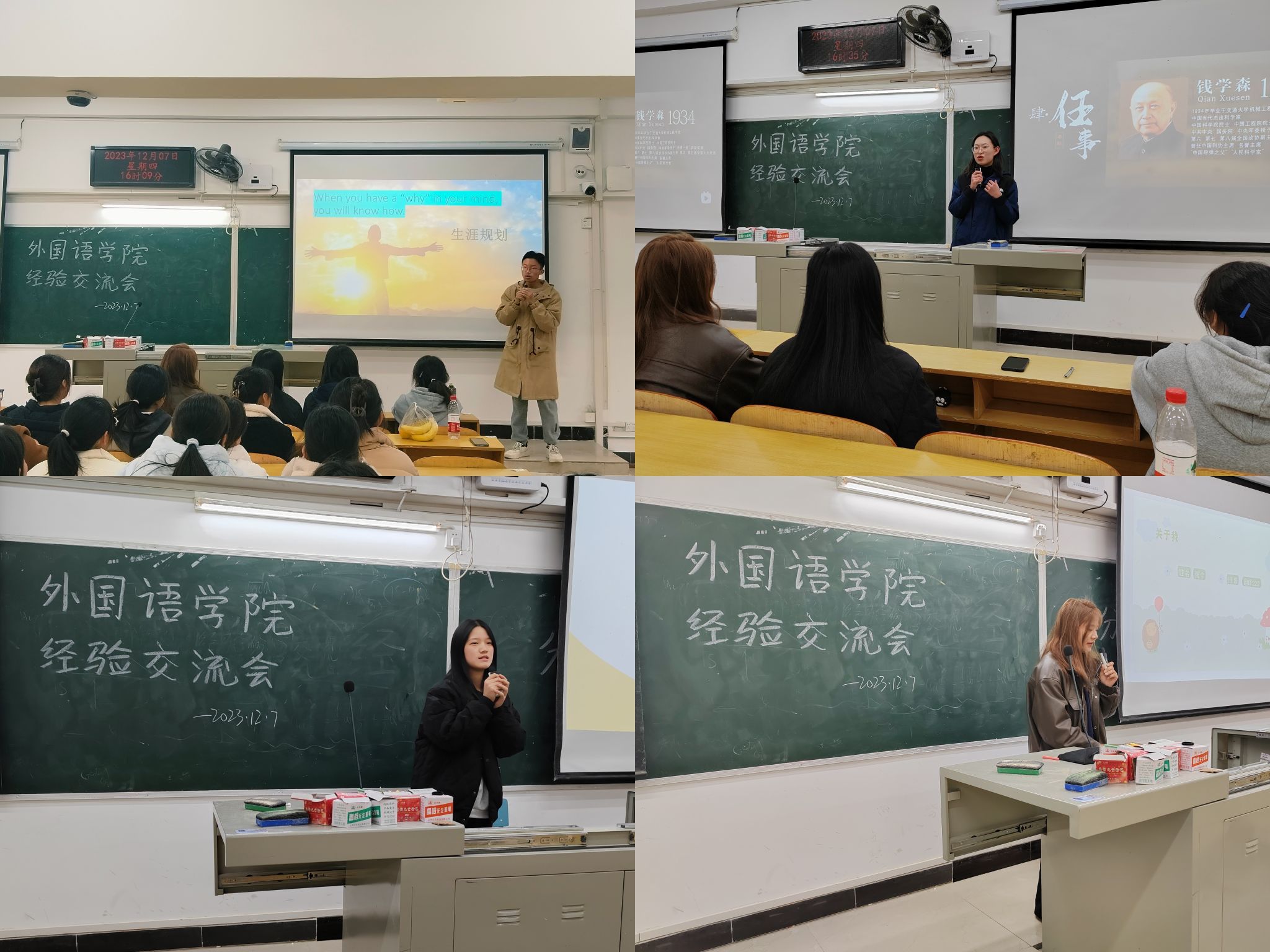 为帮助新生更好的了解老员工活,帮助同学们树立目标,外国语学院于12月7日16:00在5303教室开展了经验交流分享会,同时邀请到国奖获得者罗英杰、李云霞同学,国家励志奖学金获得者石玉好、明静、张令同学作学习经验分享。