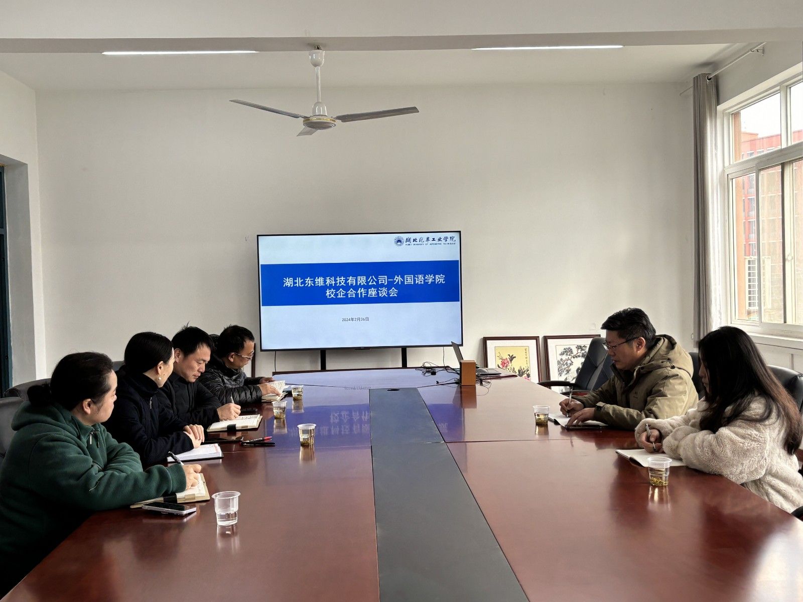 本网讯(文/图 魏院珍、孙媛)2月26日,外国语学院与湖北东维科技有限公司在3503会议室举行校企合作座谈会,湖北东维科技有限公司总经理黄清松、员工代表赵欣就校企合作相关事宜进行洽谈。外国语学院分党委书记郭义坤、副经理翟全伟、副书记魏伟、专业教师孙媛、学工办主任魏院珍参加座谈会。