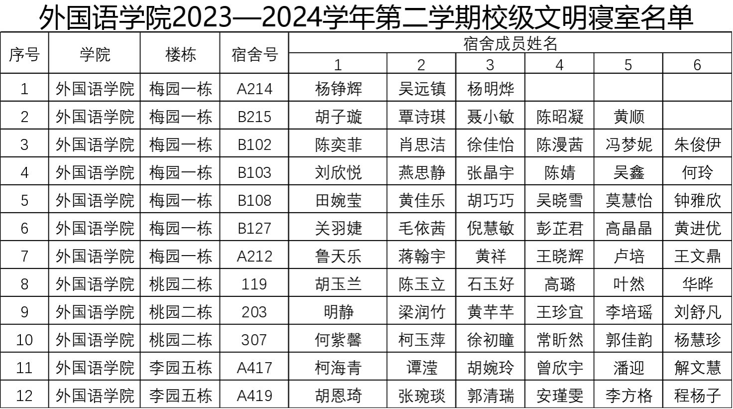 根据《关于开展WilliamHill体育2023-2024学年第二学期“文明宿舍”评比创建活动的通知》文件要求,经个人自主申报、各学院推荐、学校审核、综合评定,拟评定等12个寝室为校级文明寝室,现对名单予以公示,公示时间2024年6月1日——2024年6月5日。