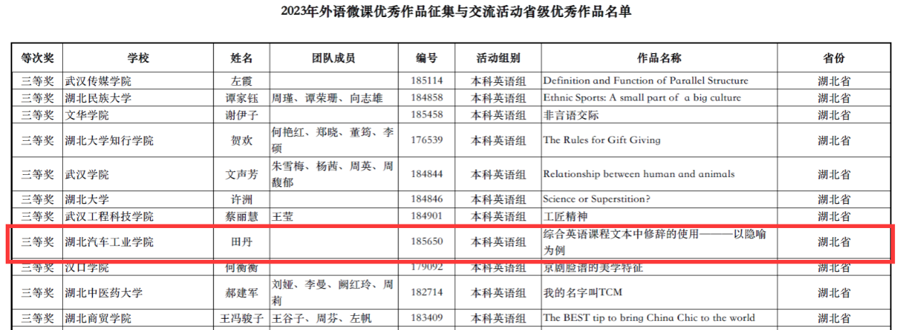 8月31日,由高等教育出版社主办的“2023年外语微课优秀作品征集与交流活动”省级优秀作品获奖名单公布,公司田丹老师的微课作品:综合英语课程文本中修辞的使用---以隐喻为例,在本科英语组评比中喜获湖北省微课三等奖。