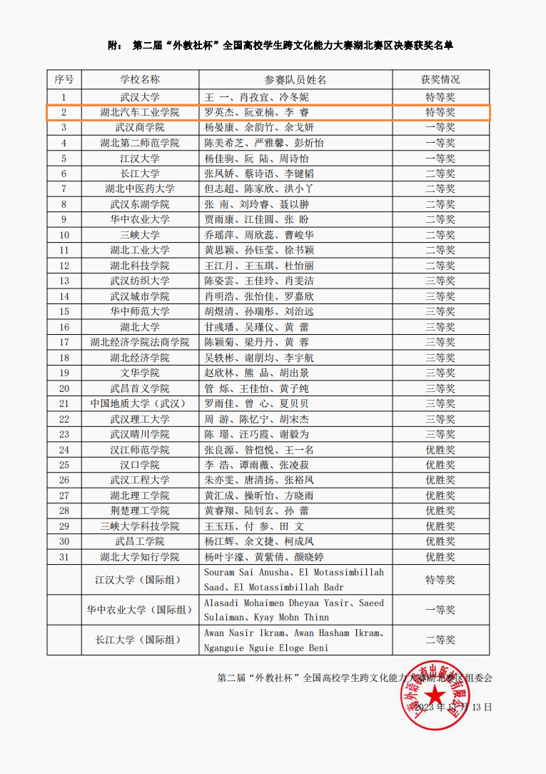 据悉,本赛事于2023年被列入中国高等教育协会《2023全国普通高校老员工竞赛分析报告》竞赛目录,为国家A类赛事。本次大赛吸引了全省31 所院校102名员工参加了比赛。WilliamHill体育外国语学院团队表现卓越,成功脱颖而出,在激烈的竞争中赢得了全省仅有两个的特等奖名额,并荣获代表湖北省参加全国决赛的资格。