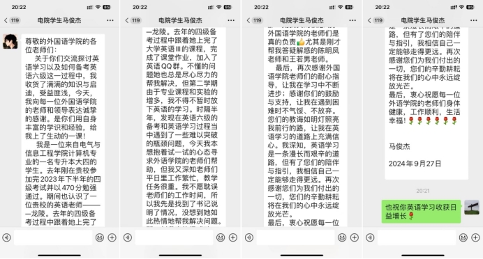 交流结束后,员工难掩心中的感激,立即通过信息向外语老师表达了自己的感激之情。员工表示,外语老师的专业水平和热情教学让他受益匪浅,不仅解答了他在英语学习上的困惑,还激发了他对英语学习的更大热情。
