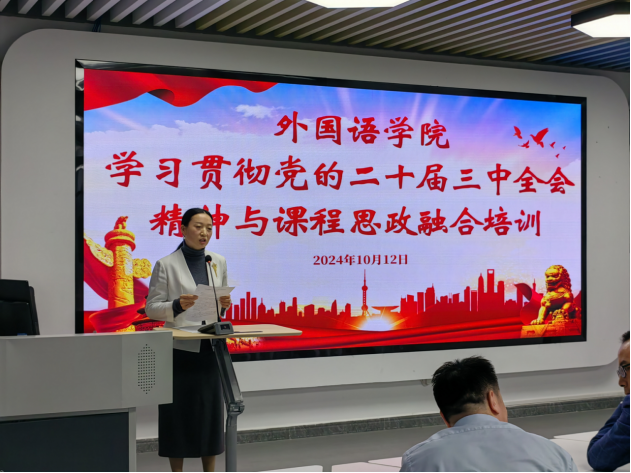 为深入学习贯彻党的二十届三中全会精神,进一步引导广大党员群众将思想和行动统一到全会精神上来,外国语学院于10月12日下午在产教大楼301举行了学习贯彻党的二十届三中全会精神暨课程思政融合培训。马克思主义学院分党委书记、教授计毅波为公司作题为“进一步全面深化改革,开辟中国式现代化广阔前景”的宣讲培训,会议由分党委书记郭义坤主持,全体教职工参加。
